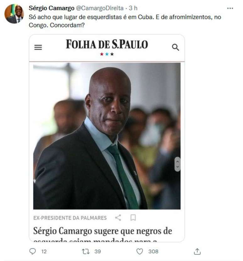 Esta foi a segunda vez que Camargo acusou o filme de Ramos de denunciar racismo do governo Bolsonaro. A primeira foi há 13 meses, em março de 2021. Na época, acusou sem ver o filme, espalhando fake news sobre seu conteúdo. Mas a cada nova manifestação, o candidato a deputado parece confirmar a denuncia artística exibida nas telas, pelo menos com negros que não votam em Bolsonaro.