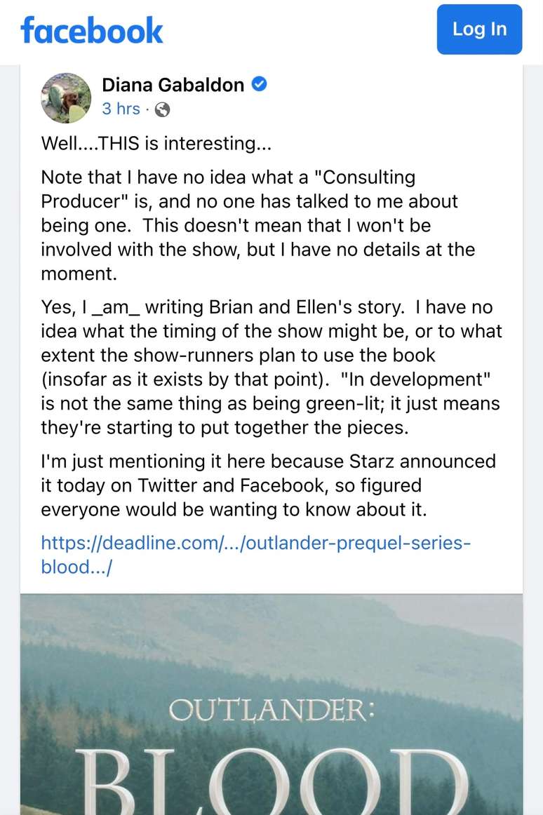 "Bem… isso é interessante… Note que eu não tenho ideia do que é um 'Produtor Consultor', e ninguém falou comigo sobre ser um", escreveu Gabaldon em sua conta oficial no Facebook na sexta-feira (5/8). "Isso não significa que não estarei envolvido com a série, mas não tenho detalhes no momento."