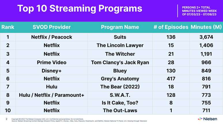 Isso é corroborado pela empresa de auditoria Nielsen. Na semana passada, ela falou sobre como, na segunda semana de julho, Suits teve um recorde de 3,7 bilhões de minutos assistidos em apenas uma semana entre a Netflix e a Peacock. Mais do que o dobro de um original da plataforma, como a segunda temporada de O Poder e a Lei.