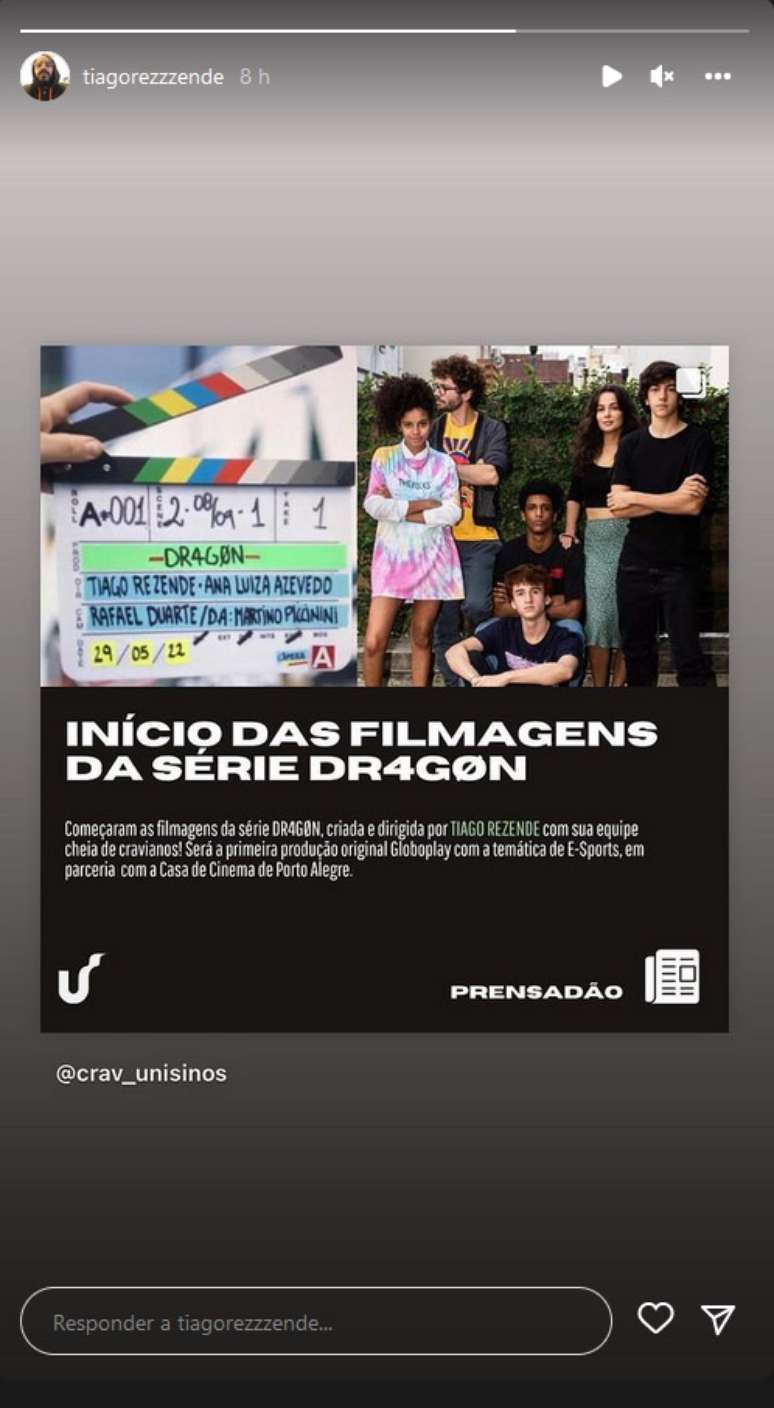 Começaram neste fim de semana as gravações de "Dragon", uma nova série da plataforma Globoplay. A novidade foi anunciada nos perfis de Instagram da atriz Fernanda Marques (a filha de Andréa Beltrão em "Um lugar ao Sol"), que estrela a produção, e do criador Tiago Rezende ("Necrópolis") - que também é guitarrista da banda de rock Teto das Nuvens.