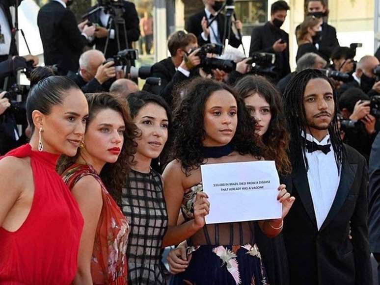 Além das imagens glamorosas e a felicidade de estar num país que já superou o pior da pandemia, as fotos também registram os protestos da equipe em pleno tapete vermelho do festival, segurando uma cartaz contra a atuação do governo brasileiro no combate à covid-19, e durante a exibição do filme, em que os cartazes se multiplicaram, lembrando também o problema das invasões de terras indígenas.