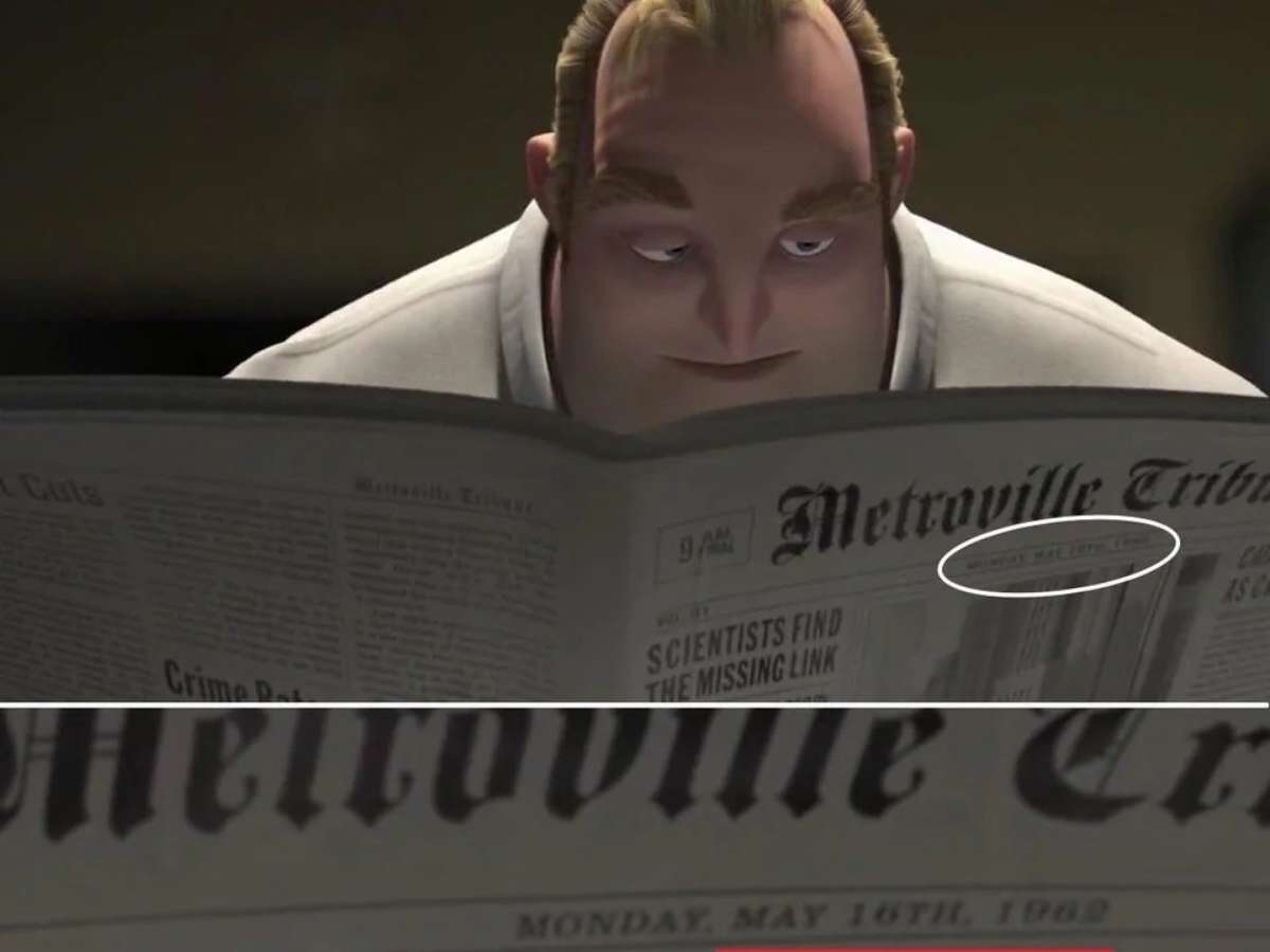 Há uma segunda pista que é definitiva: o jornal que o Beto lê em outro momento de 'Os Incríveis 2', o chamado Metroville Tribune. Na primeira página está a seguinte manchete: "Cientistas encontram o elo perdido", seguida do subtítulo "A história impressionante". A data da publicação é segunda-feira, 16 de maio de 1962.