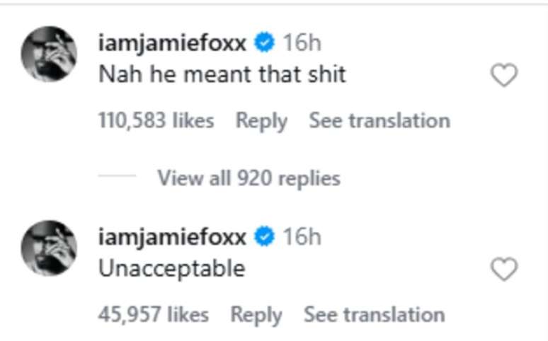 Nos comentários de uma publicação do momento nas redes sociais, Jamie Foxx classificou o episódio como "inaceitável" e afirmou: "Não, ele realmente quis falar aquilo".