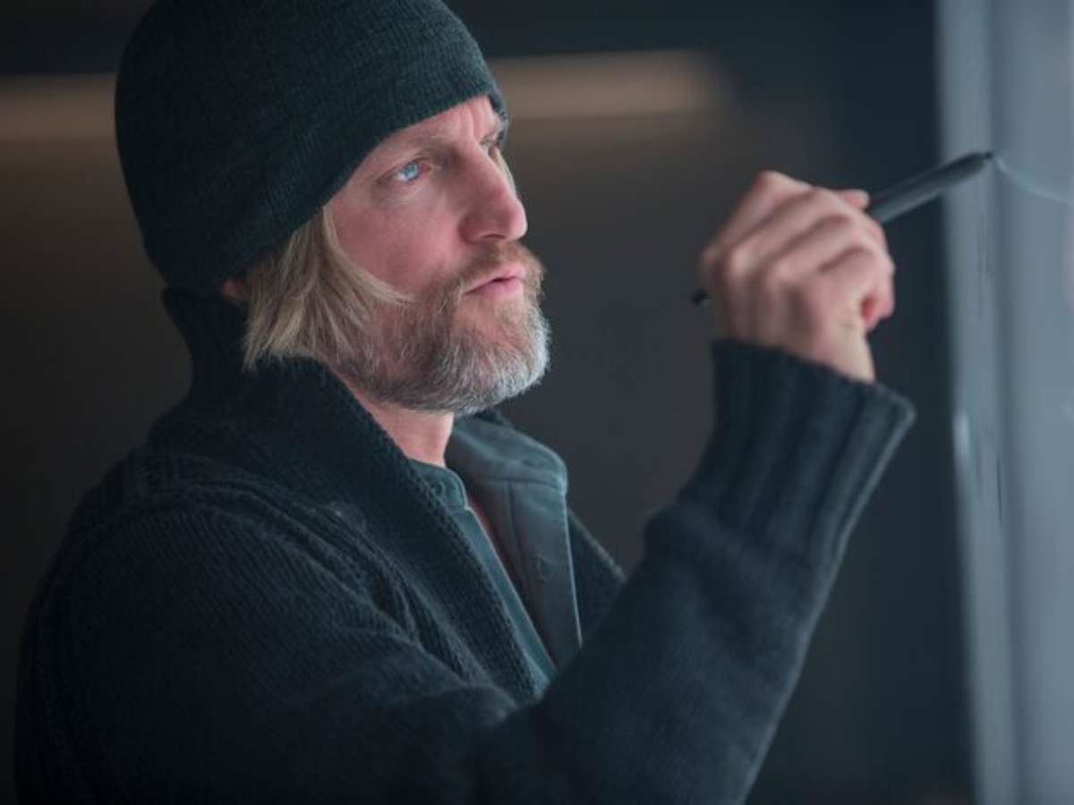 Haymitch Abernathy, o personagem cujo ator aparece no início do vídeo de divulgação, é um dos tributos do Distrito 12 e também está presente nos três primeiros filmes da saga como mentor dos protagonistas Katniss e Peeta. Nos três primeiros filmes, ele é vivido por Woody Harrelson.