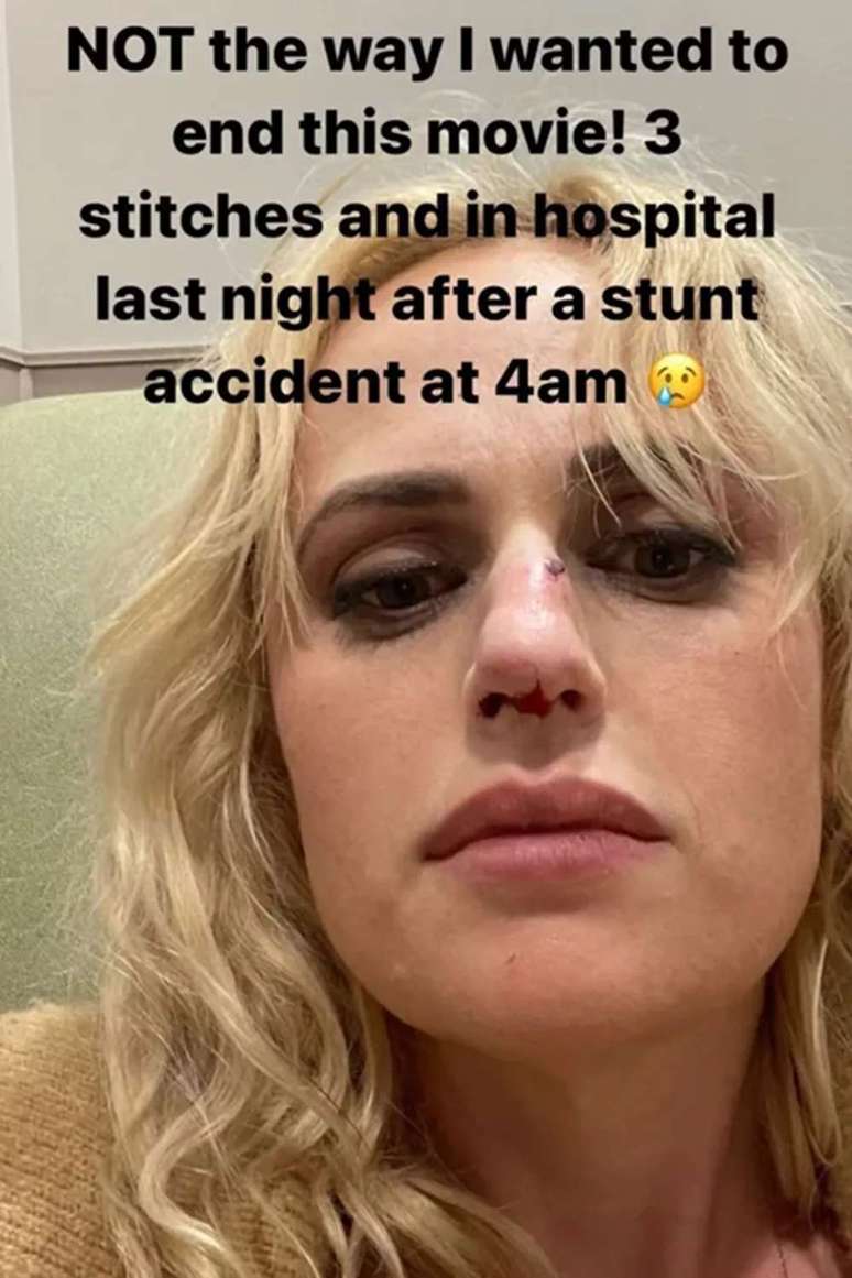 Em uma postagem nos Stories, ela mostrou seu rosto após receber pontos. "Não é a maneira que eu queria terminar este filme!", ela legendou. "3 pontos e no hospital ontem à noite após um acidente de dublê às 4 da manhã."