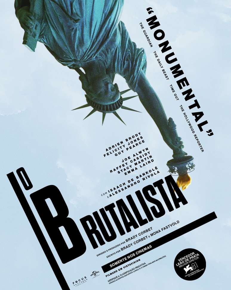 A Universal Pictures divulgou o primeiro trailer e pôster oficial de "O Brutalista" (The Brutalist), drama dirigido por Brady Cobert ("Vox Lux"), que foi reconhecido com o Leão de Prata de Melhor Direção no Festival de Veneza. Tanto o pôster quanto a prévia exaltam elogios da crítica ao filme, que tem 97% de aprovação no Rotten Tomatoes por sua narrativa sobre fuga, reconstrução e o custo do poder e do legado.