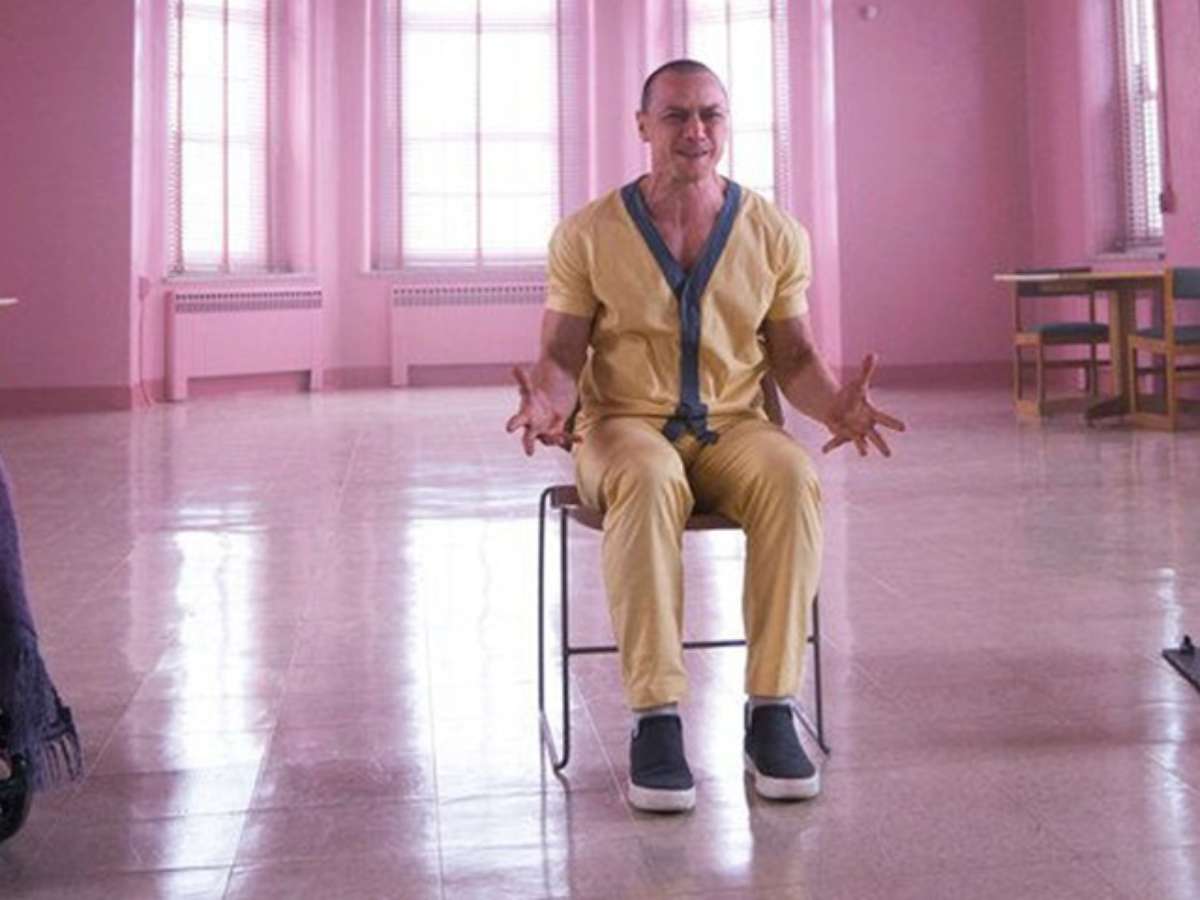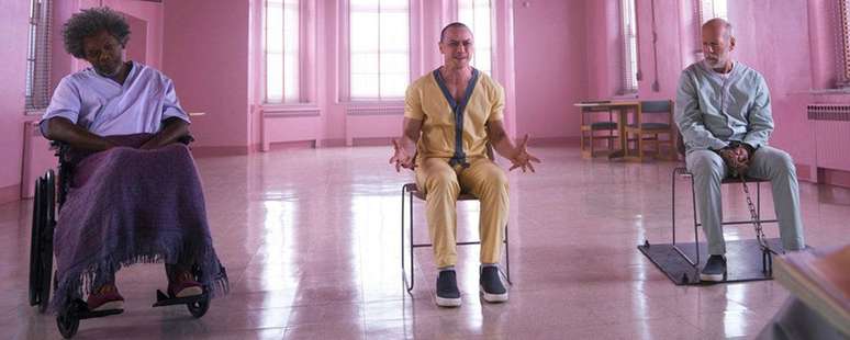 Em uma das fotos reveladas pela Entertainment Weekly, os personagens Elijah Price (Jackson), David Dunn (Willis) e Kevin Crumb (McAvoy) aparecem em um hospício, onde também marca presença a atriz Sarah Paulson (Oito Mulheres e Um Segredo e AHS), que interpreta uma psiquiatra. O diretor Shyamalan também foi clicado em cena de bastidores ao lado do astro de Duro de Matar.