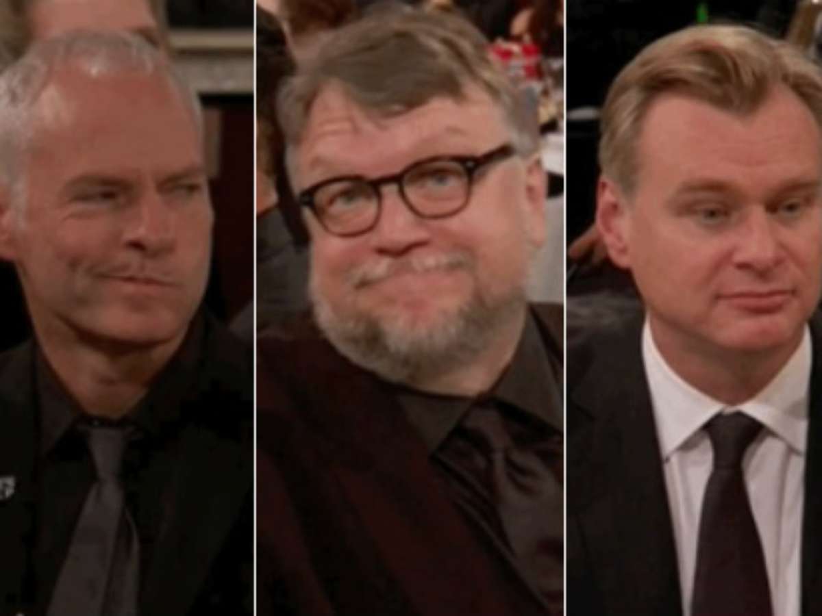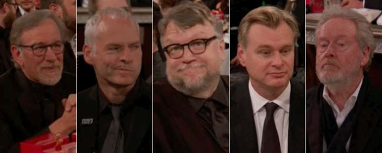 Oprah Winfrey roubou a cena na noite do último domingo (7), fazendo um discurso poderoso ao receber o prêmio Cecil B. DeMille no Globo de Ouro 2018. Portanto, tarefa nada fácil para quem quer que a sucedesse. Ron Howard seguiu o protocolo, se dizendo honrado por anunciar o vencedor do prêmio de direção. Já Natalie Portman achou por bem fugir do roteiro — e também brilhar em seu momento. "Estes são os indicados, todos homens", disse a atriz, seca, pegando a todos de surpresa. No caso dos cineastas indicados, restou o constrangimento. Abaixo (via Vulture), confira a expressão de embaraço de cada um deles: Christopher Nolan (Dunkirk): Steven Spielberg (The Post - A Guerra Secreta): Ridley Scott (Todo o Dinheiro do Mundo): Martin McDonagh (Três Anúncios para um Crime): Guillermo del Toro (A Forma da Água), vencedor do prêmio:
