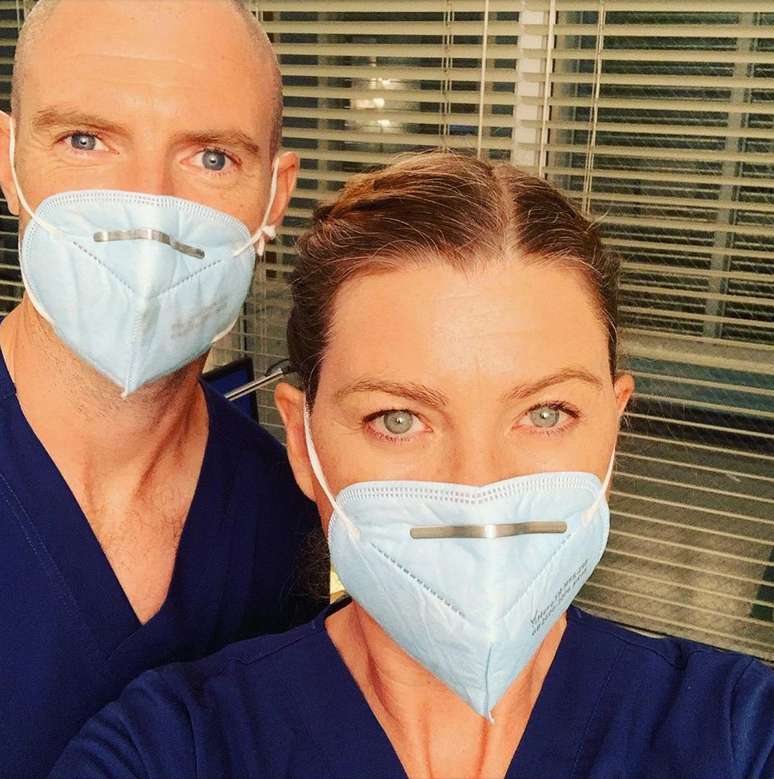 Kevin McKidd, que vive o Dr. Owen Hunt, postou uma foto ao lado de Kim Raver, a Dra. Teddy Altman, enquanto Ellen Pompeo, que interpreta a protagonista Meredith Grey, posou ao lado do colega Richard Flood, o Dr. Cormac Hayes. Todos apareceram usando máscaras de proteção nos bastidores na produção da rede americana ABC.