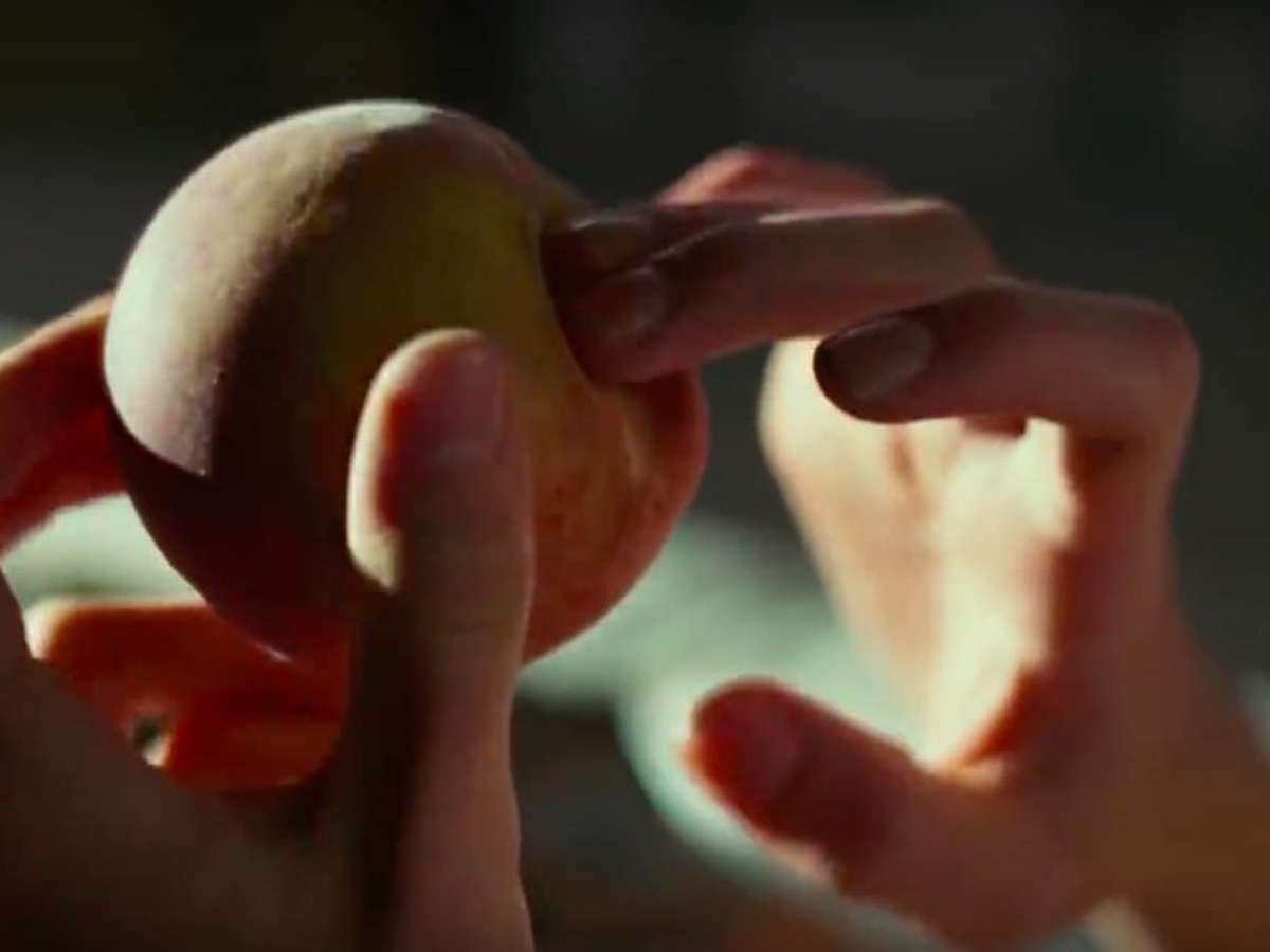 Na cena em questão, Elio (Chalamet) está sozinho, observando um pêssego. Até que decide arrancar o caroço da fruta e se masturbar com ela. Após finalizar o ato, o jovem é surpreendido pela presença de Oliver (Hammer), que constrangendo seu amado, provoca-o, sugerindo de forma muito enfática e convincente que ele comerá o pêssego