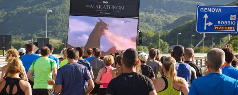 A emissora européia Sky Atlantic levou o conceito de 'maratona de série' ao pé da letra para divulgar a estreia da sétima temporada de Game of Thrones, e promoveu uma maratona (literalmente) na Itália. O diferencial é que, durante a corrida, os participantes seguiam um carro com um telão acoplado, que justamente transmitia os episódios das seis primeiras temporadas da série.