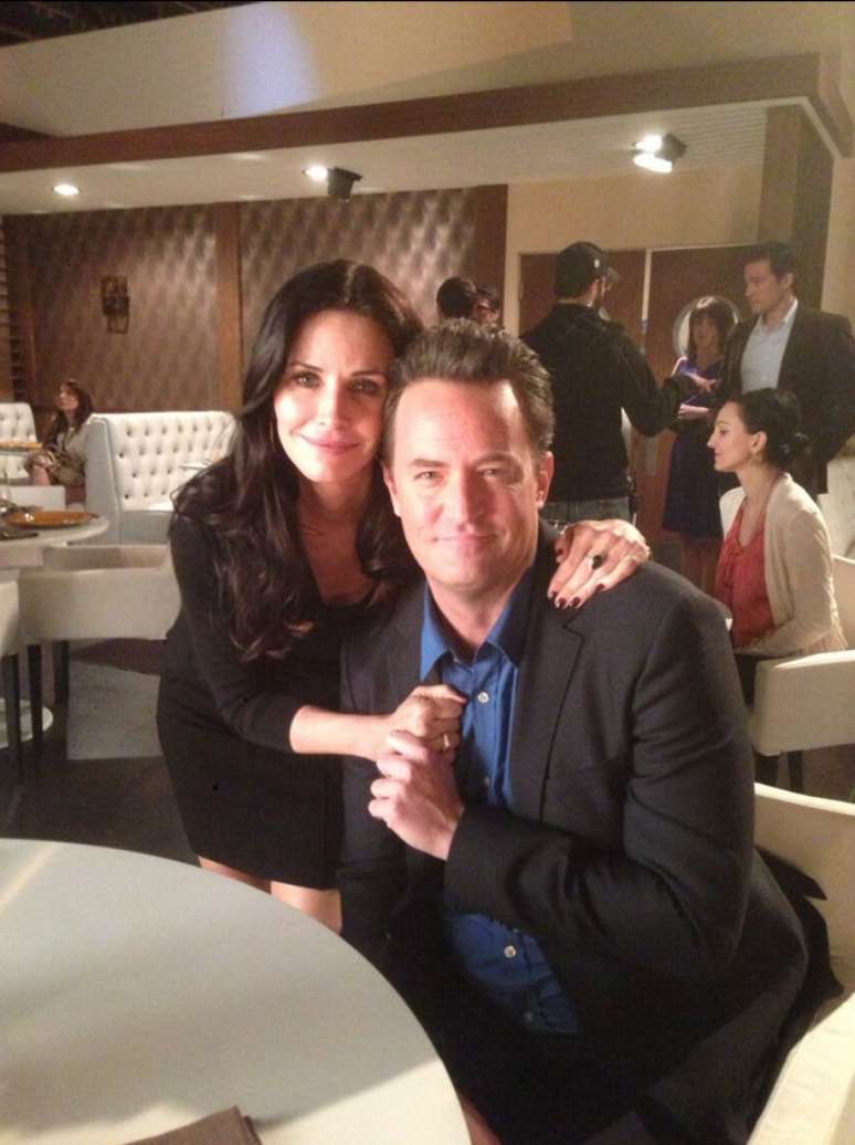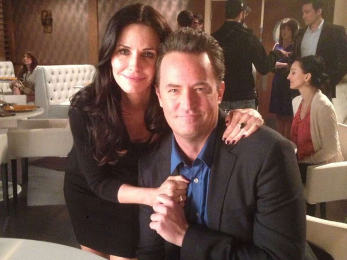Em seu perfil na rede de microblogs Twitter, o ator Matthew Perry, famoso na pele do personagem Chandler, da série Friends, divulgou nesta terça-feira (19), uma foto em que aparece ao lado de Courtney Cox, que interpretava sua mulher, Monica, no seriado. Os dois se reencontraram para gravar um episódio da série Go On, protagonizada por Matthew, no canal NBC.