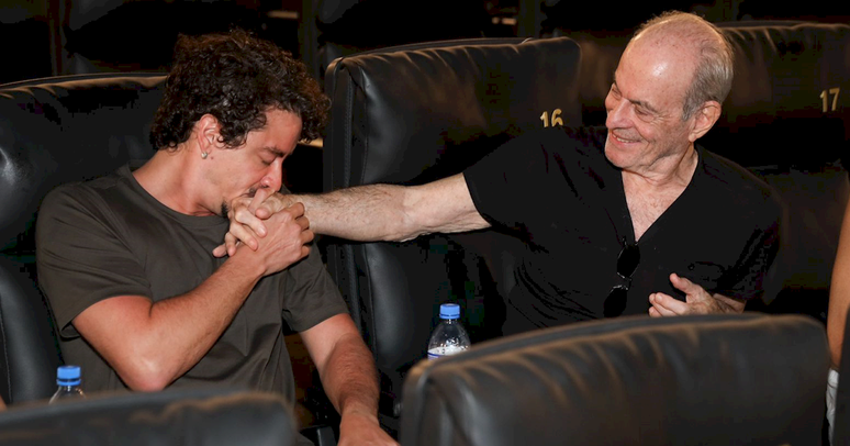Ney Matogrosso e Jesuíta Barbosa assistem juntos ao filme 'Homem com H'. Veja as fotos
