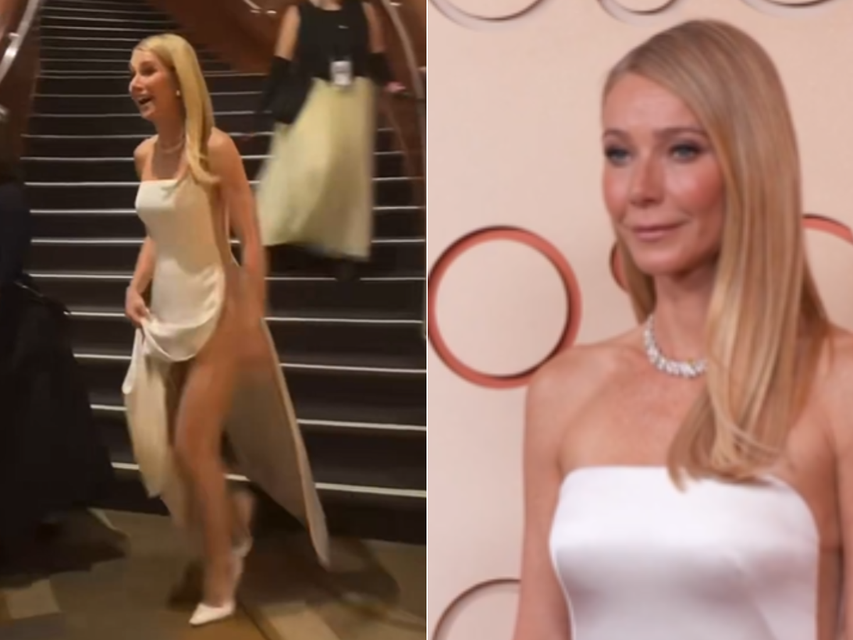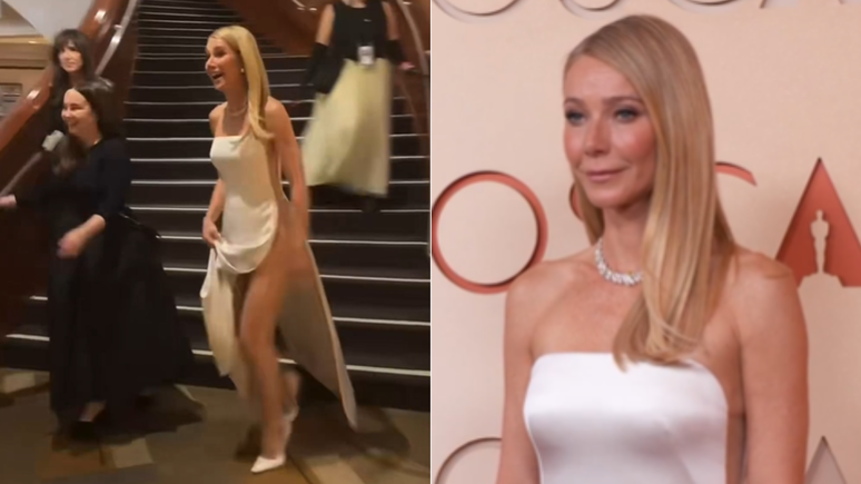 Em um vídeo que circula nas redes sociais, Paltrow aparece descendo escadas correndo e passa por um pequeno perrengue com o look. Para evitar tropeçar ou mostrar demais, ela segura o vestido enquanto desce rapidamente.