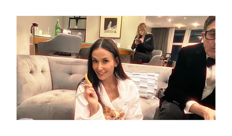 Nem champanhe, nem festa. Após perder o Oscar 2025, Demi Moore surge no chão, só de roupão, e encontra conforto em duas tigelas GIGANTES