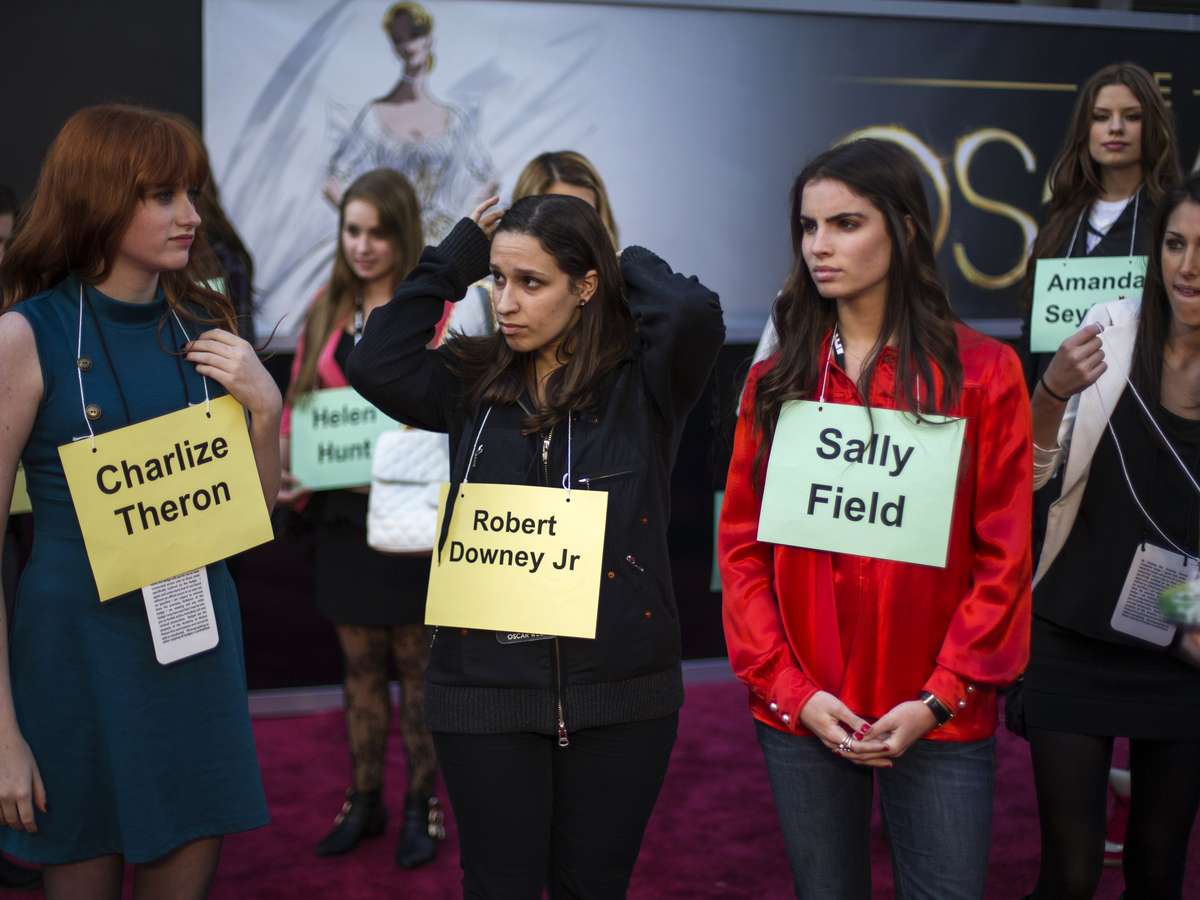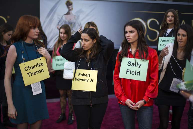 Anônimos se divertiram ao representarem celebridades em ensaio realizado no sábado (23), para a cerimônia do Oscar. Cada pessoa carregou uma placa que representava um convidado que estará na premiação. Entre os nomes estavam Adele, Amy Adams, Charlize Theron, Sally Field, entre outros
