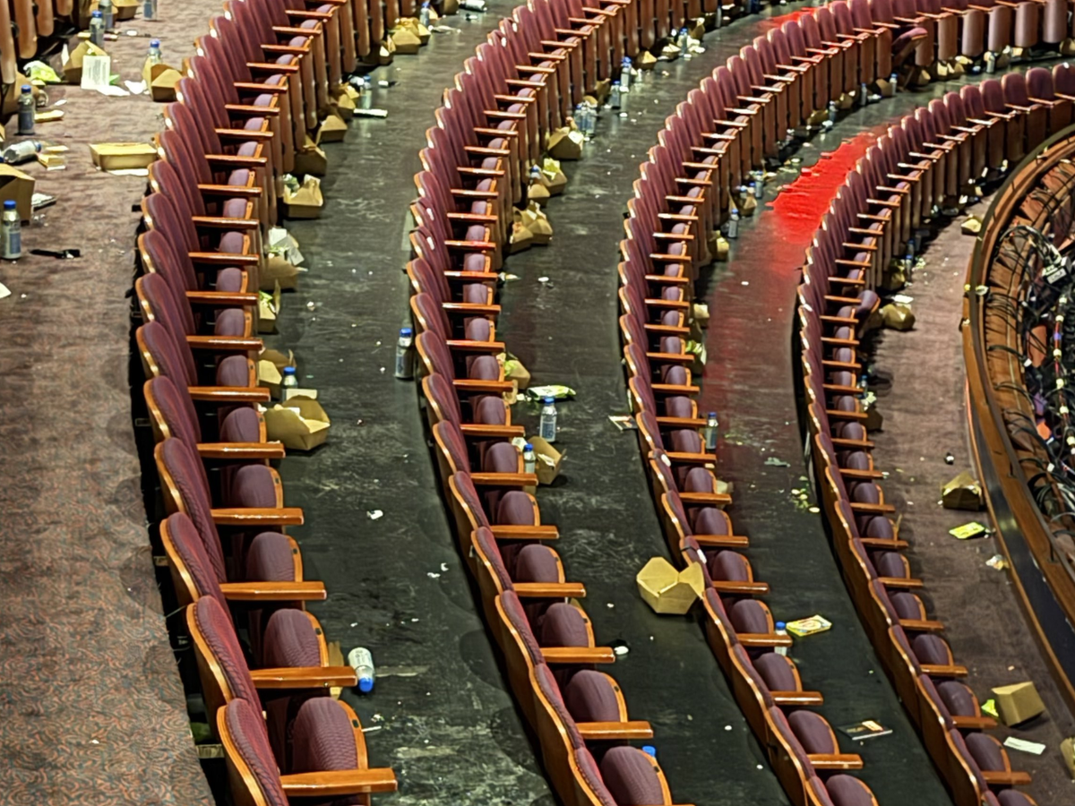Um jornalista americano compartilhou uma imagem que mostra o Dolby Theater, em Los Angeles, totalmente sujo após o final da cerimônia do Oscar 2026, na madrugada desta segunda-feira, 16.