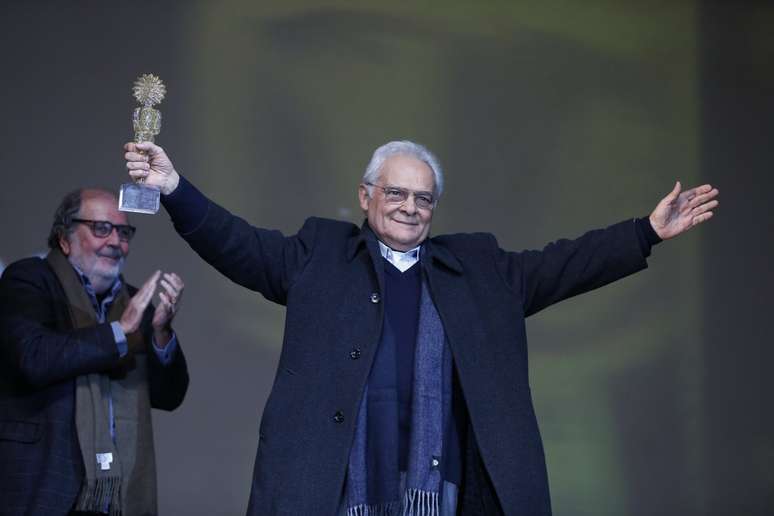 Othon Bastos com seu Kikito de Cristal, o primeiro a ser entre a um ator em Gramado