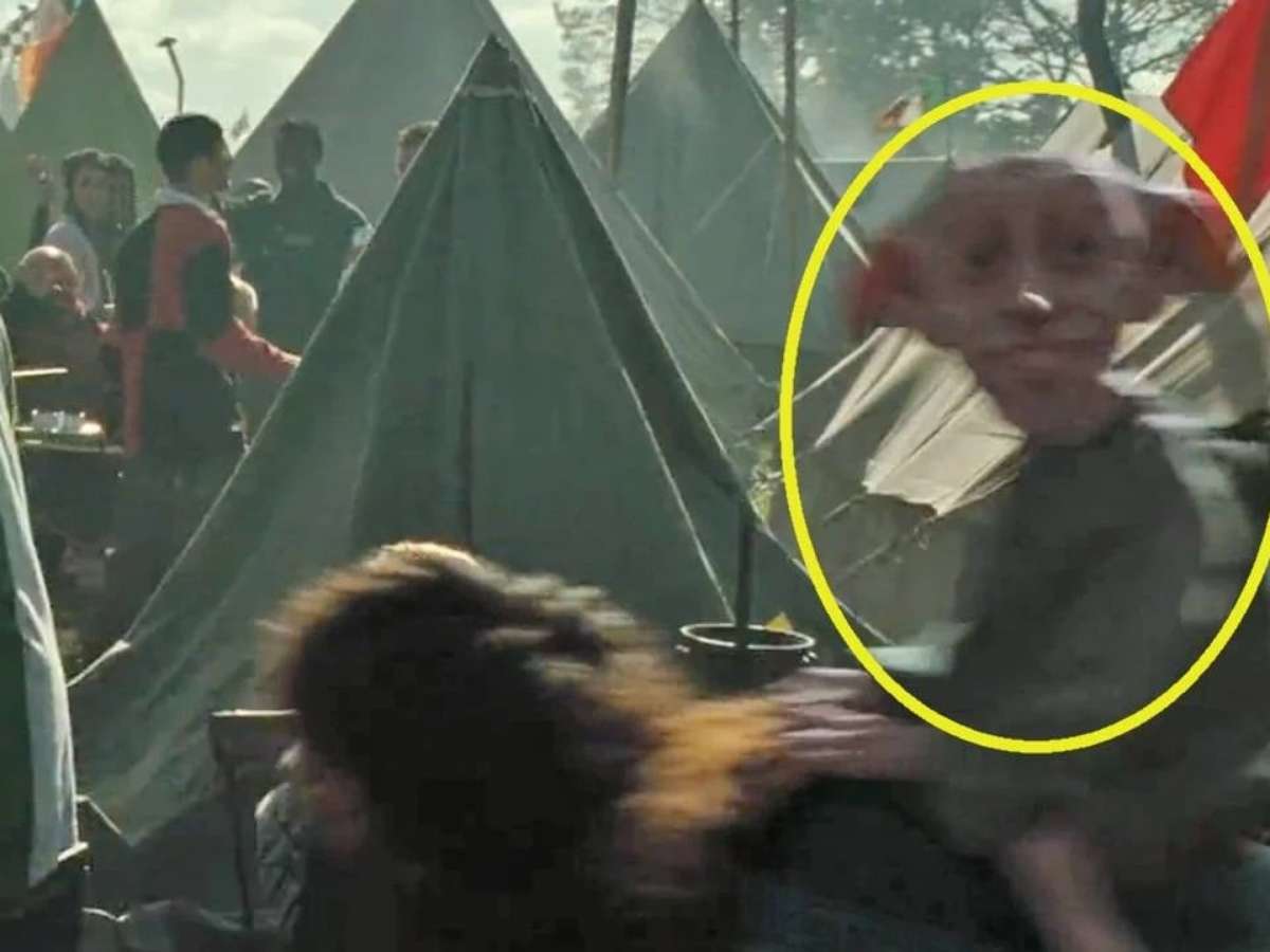 Sim, é Dobby quem aparece ali, todo feliz, dando uma olhada na câmera para o espectador, mesmo precisando de um controle remoto para vê-lo. Dobby foi libertado do jugo Malfoy desde o final de Harry Potter e a Câmara Secreta e agora está livre para fazer o que quiser... Como montar uma lhama.