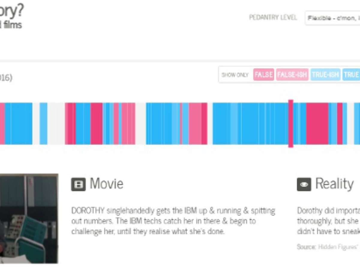 Usando uma espécie de gráfico em forma de barra, os jornalistas e designers da plataforma dividem os filmes em cenas e usam cores diferentes, de forma similar a um código de barras, para classificar se os momentos em questão são falsos, mais ou menos falsos, verdadeiros, mais ou menos verdadeiros ou desconhecidos. Ao clicar nas lacunas, ainda é possível ler uma descrição do que acontece no filme e a realidade dos fatos. Confira o layout: