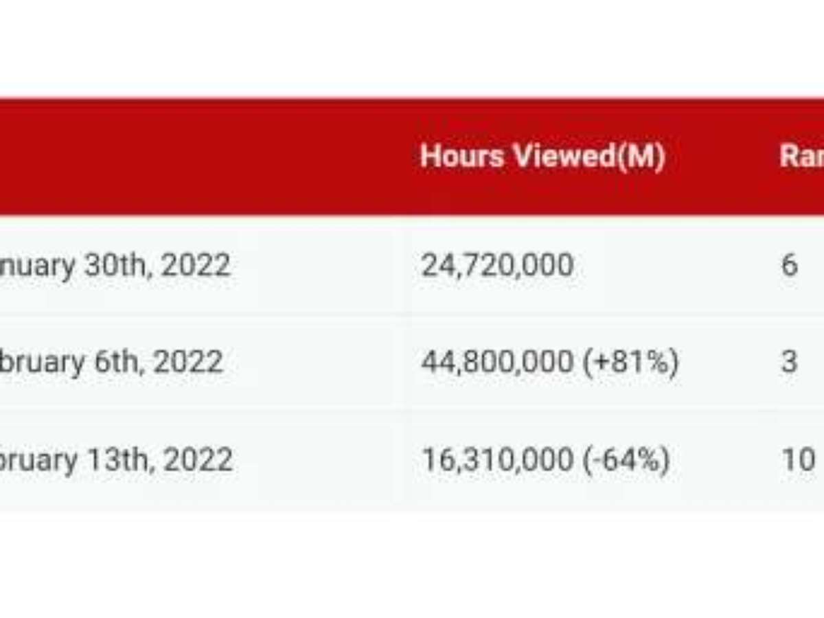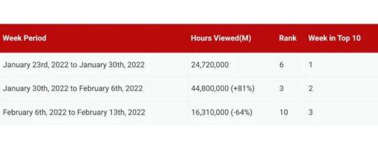 À Tona foi lançada em 28 de janeiro, portanto, só foi transmitida por dois dias na primeira semana estudada. A série não entrou no top 10 entre 14 e 20 de fevereiro, o que significa que obteve menos de 11,04 milhões de horas de exibição.