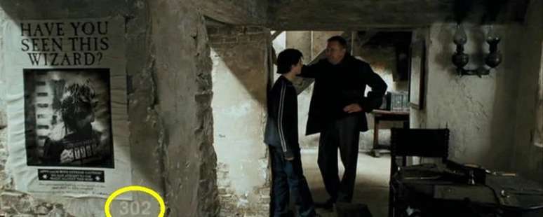 Na cena em que o Sr. Weasley chama Harry de lado para lhe dizer que Sirius Black está procurando por ele, olhe atentamente para a parte inferior da tela, logo abaixo do canto inferior direito do cartaz de procurado. Você notará que o número 302 aparece muito discretamente (veja acima).