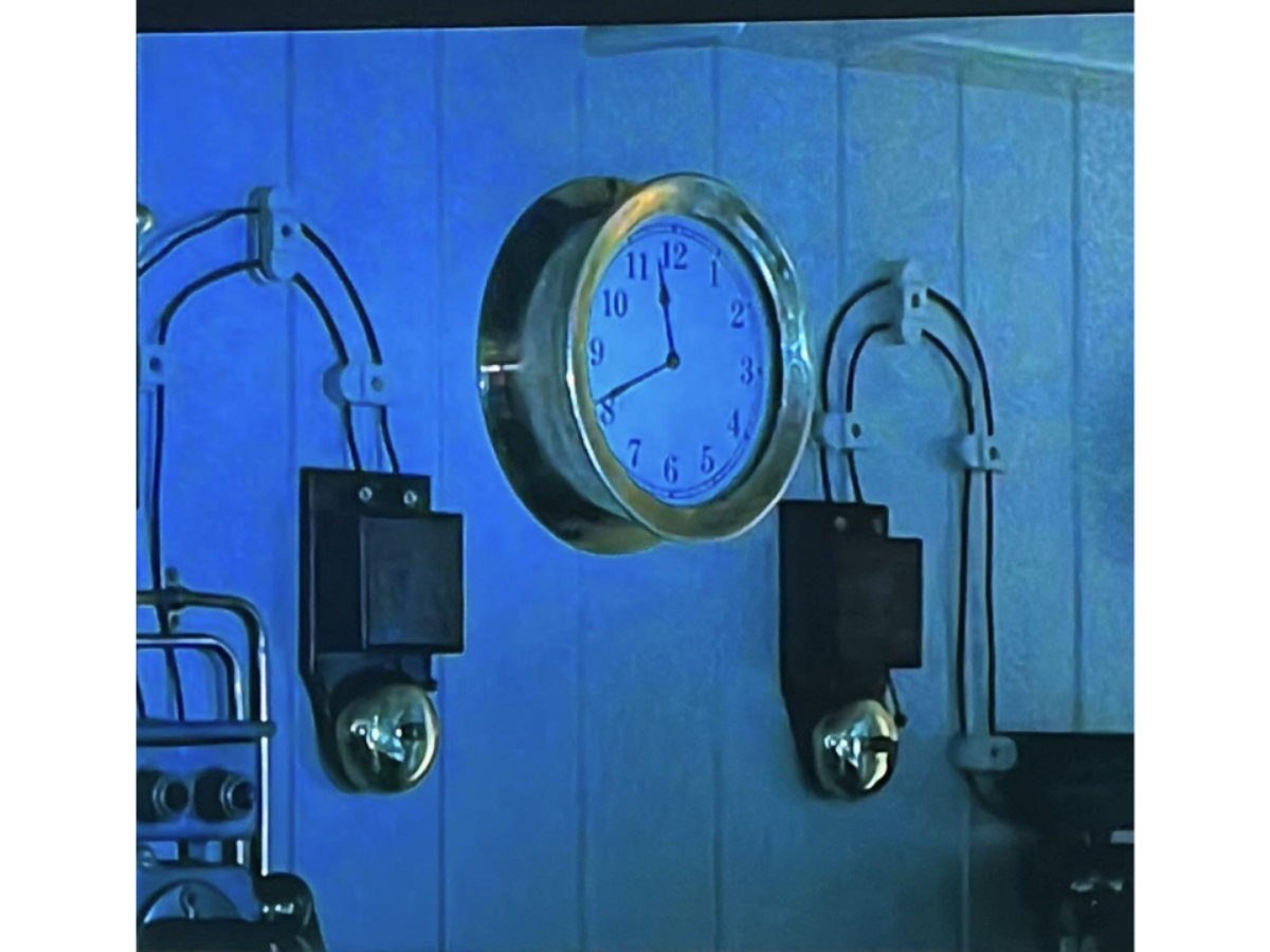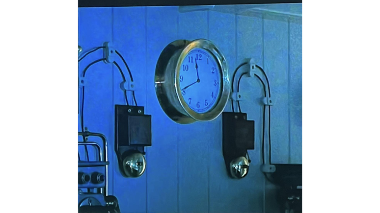 Nesse exato momento, pouco depois de a embarcação colidir com o iceberg, vemos brevemente um relógio pendurado na parede entre campainhas e fios. Os ponteiros marcam 11:40, um horário que, a princípio, não quer dizer nada. Porém, foi justamente às 23h40 do dia 14 de april de 1912 que o verdadeiro Titanic naufragou em pleno Oceano Atlântico.