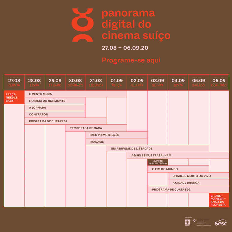 A plataforma Sesc Digital começa a disponibilizar na noite desta quinta (27/8) uma mostra gratuita de filmes suíços, que se estenderá até o dia 6 de setembro.