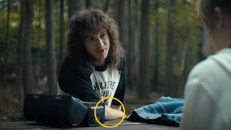 Estamos no episódio 1, durante a segunda aparição de Eddie. Ele está com Chrissy (Grace Van Dien) na floresta. Se você pausar o programa aos 47 minutos e 39 segundos, poderá ver uma tatuagem de... um morcego aparecer no braço do estudante. Deve ter sido uma escolha bem pensada, já que ele é morto por eles alguns dias depois.