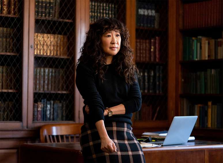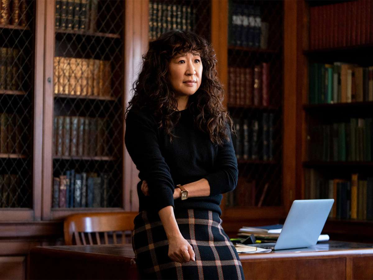Em The Chair, minha nova série de dramédia, Sandra Oh interpreta uma professora que é a primeira mulher responsável pelo departamento de inglês na Pembroke University.📚