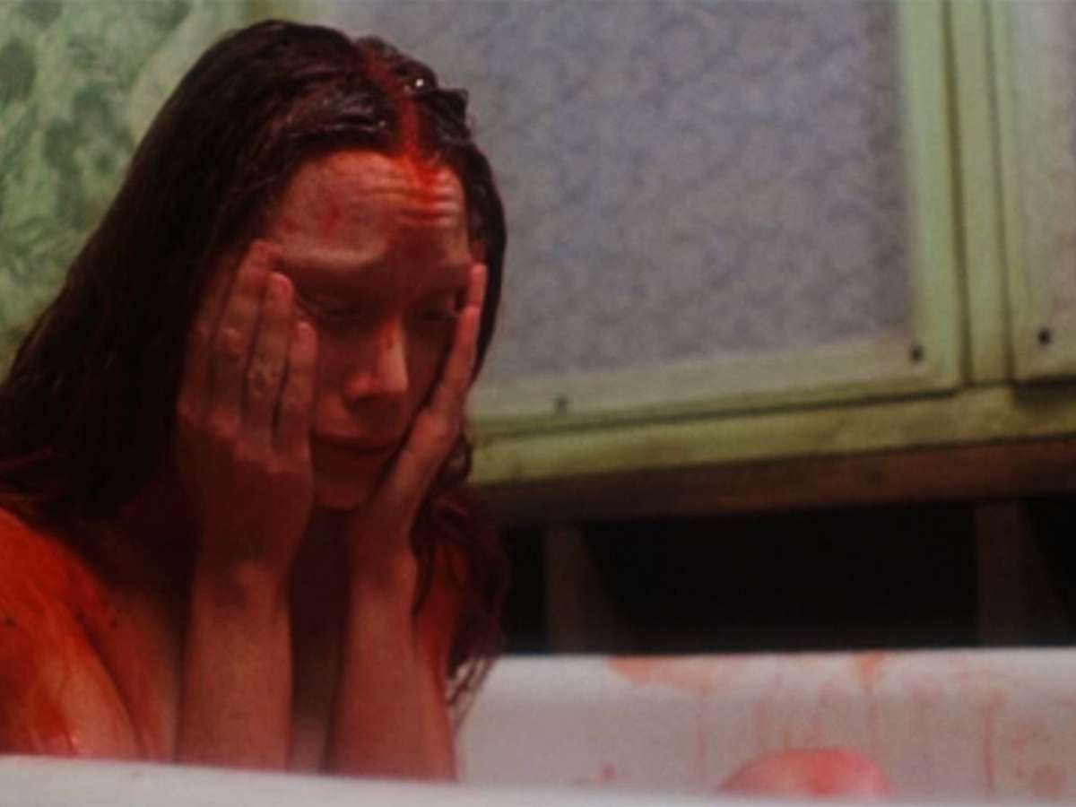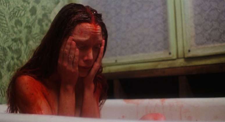 Uma das cenas mais icônicas de Carrie, a Estranha acontece logo na abertura do filme, quando a protagonista interpretada por Sissy Spacek menstrua pela primeira vez no chuveiro do vestiário feminino, assustada sem entender o que está acontecendo.