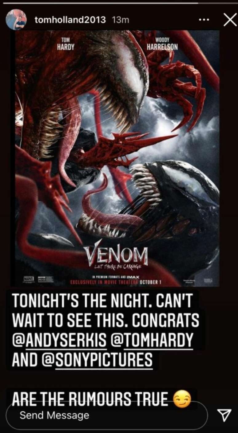 O ator Tom Holland resolveu explorar a expetativa dos fãs da Marvel pelo encontro entre Homem-Aranha e Venom nos cinemas com uma mensagem em seu stories no Instagram. Ele postou sobre a estreia de "Venom: Tempo de Carnificina", que aconteceu na sexta-feira (1/10) nos EUA. "Será que os rumores são verdadeiros?", escreveu, acrescentando um emoji debochado. Veja abaixo.