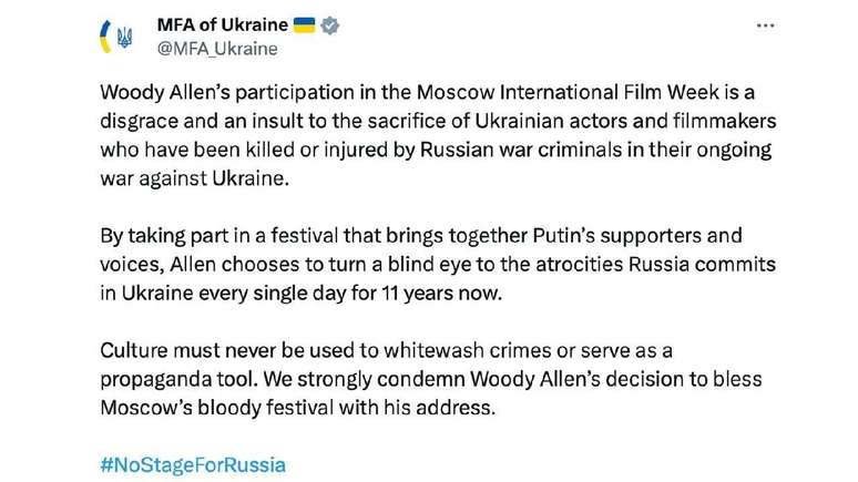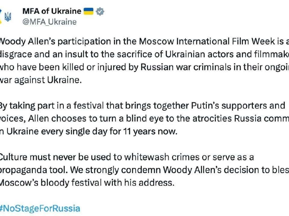 "A participação de Woody Allen na Semana Internacional de Cinema de Moscou é uma vergonha e um insulto ao sacrifício de atores e cineastas ucranianos que foram mortos ou feridos por criminosos de guerra russos em sua guerra em andamento contra a Ucrânia."