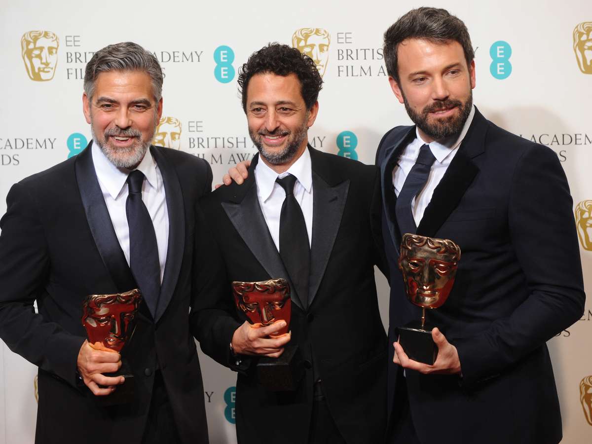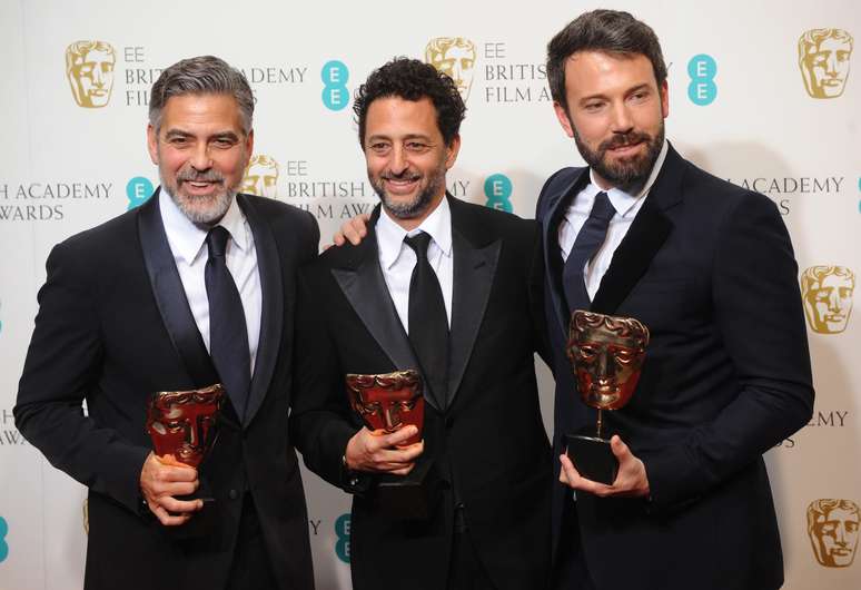 Os produtores George Clooney e Grant Heslov posam ao lado do ator e diretor Ben Affleck após conquistarem o Bafta de Melhor Filme por 'Argo', neste domingo (10), na Royal Opera House de Londres, na Inglaterra