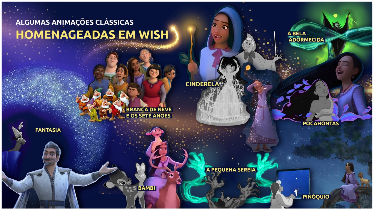 Como já antecipamos, por ser um filme comemorativo, Wish tem diversas referências a animações da Disney — desde as clássicas, como Branca de Neve e os Sete Anões, às mais atuais, como Enrolados. A capacidade de ativar memórias bonitas de diferentes gerações, como pais e filhos, é um dos trunfos do desenho, que ainda homenageia ícones de sua trajetória. As expressões da estrelinha Star, por exemplo, se baseiam nas reações e caretas de Mickey Mouse. Já a Árvore dos Desejos na qual a protagonista Asha se senta é inspirada numa árvore real: a Árvore dos Sonhos da fazenda de Walt Disney, no Missouri (EUA), onde ele teve suas primeiras e formidáveis ideias.