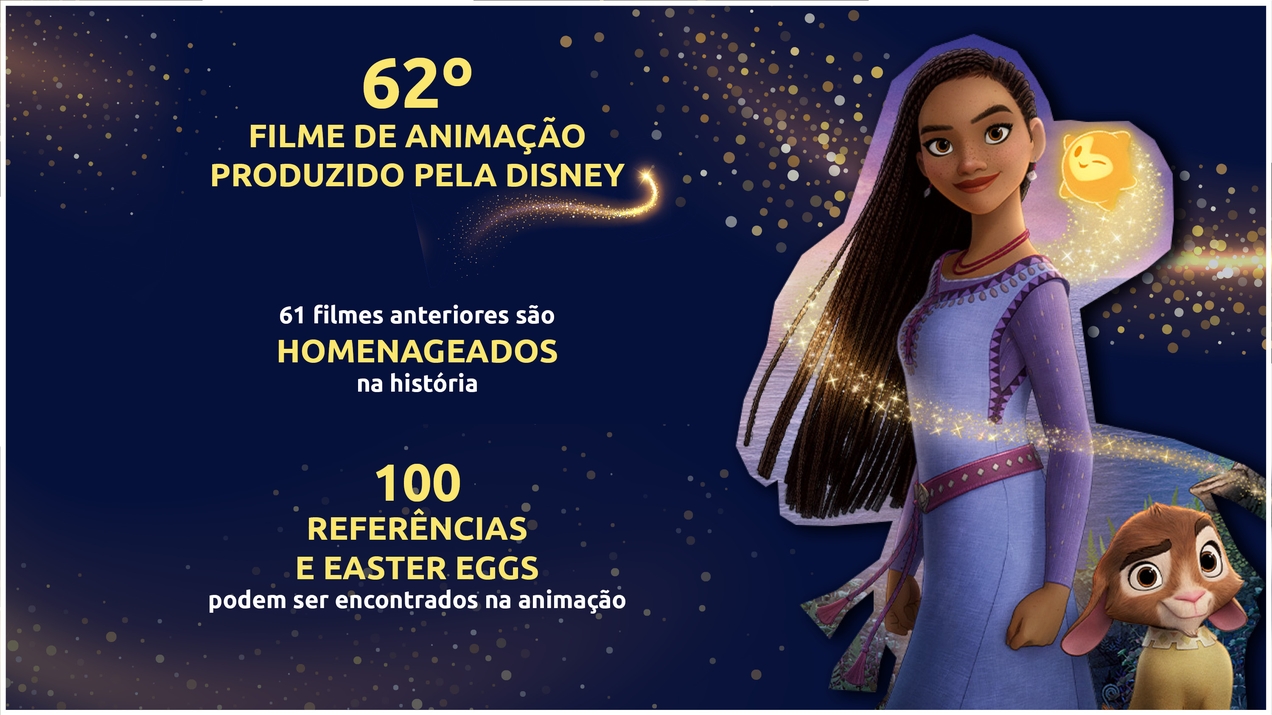 Wish é o 62º filme de animação da Disney e abraça um tema importante em todos os enredos do célebre estúdio: os desejos que podem se tornar realidade. Para transmitir essa mensagem, a animação conta como nasceu a estrela que realiza os sonhos de diversos personagens, a partir da trajetória de Asha, uma garota otimista de 17 anos que quer salvar a comunidade à qual pertence do egoísmo de um rei tirano.