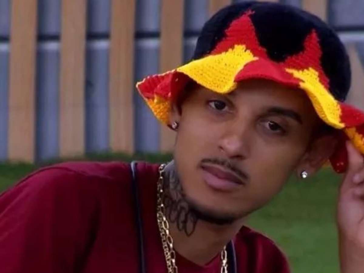 O participante impressionou os colegas de confinamento e o público ao usar um acessório bordado com estampa de chamas nas bordas, combinando com o seu penteado. O bucket foi feito à mão por sua esposa, Raquel Castro.