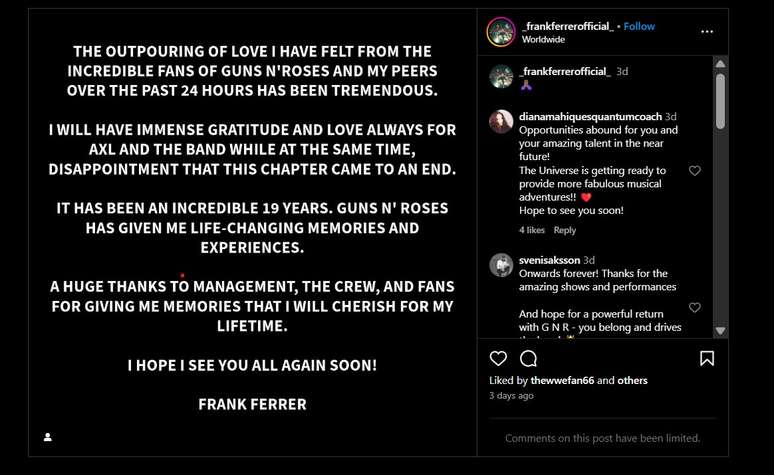 "Frank entrou no Guns N' Roses durante um show em junho de 2006", informou o texto. "Ele ajudou a sustentar a seção rítmica durante as turnês seguintes, incluindo as mais recentes com a reunião de Axl Rose, Slash e Duff McKagan."