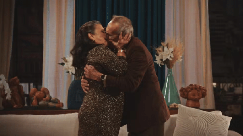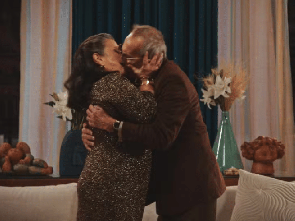 "Você é tudo e muito mais, minha frutinha suculenta. Que cútis, que olhar, que boca. Eu não vou aguentar, vou ter que...", diz ele antes de dar um beijão na mulher.