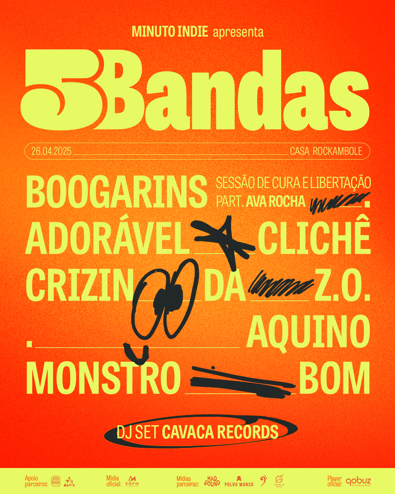 No próximo 26 de abril (sábado), a Casa Rockambole, em São Paulo, recebe a 6ª edição do Festival 5 Bandas - uma iniciativa que coloca em destaque a música autoral e a diversidade sonora da nova geração. Com ingressos ainda disponíveis online, o evento começa às 17h e reúne nomes como Boogarins, Ava Rocha, Adorável Clichê, Monstro Bom, Crizin da Z.O. e Aquino em uma noite de descobertas musicais.