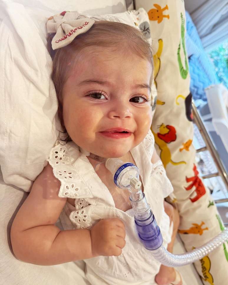 Tempos depois, Letícia mostrou a bebê sorridente já na cama do hospital: "Vamos, Guilhermina? Trocar essa cânula de novo. Eu não acredito, não", brincou com a filhota. Depois do procedimento, ela a parabenizou pela coragem: "Tudo bem? Passou o sufoco. Muito bem, você foi muito corajosa!"