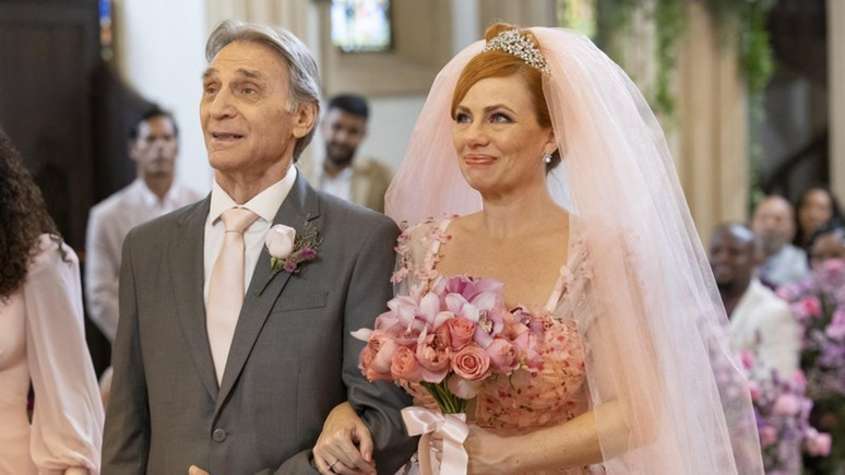 Aldeíde aparece deslumbrante, vestida de noiva e visivelmente emocionada, caminhando até o altar ao lado de Poliana (Matheus Nachtergaele), que a acompanha num dos momentos simbólicos da cerimônia. Enquanto isso, Laudelino espera ansioso diante do padre, pronto para dizer "sim" em uma das cenas mais tocantes da trama.