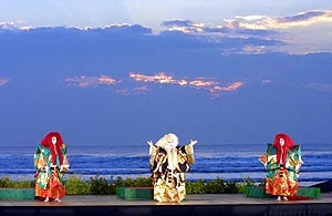 As três dançarinas fazem sua apresentação na praia de Naruto, a 60 quilômetros de Tóquio para comemorar a chegada de 2002.