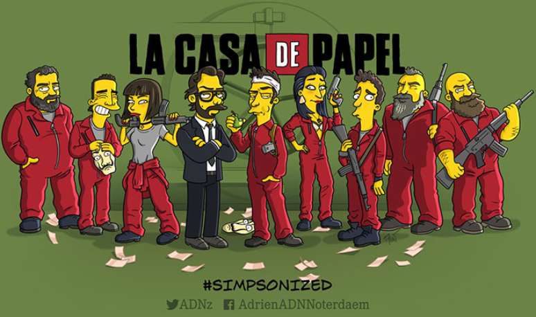 A série espanhola La Casa de Papel fez tanto sucesso que a terceira temporada já foi confirmada pela Netflix, em abril último. E, pra comemorar, o ilustrador belga Adrien Noterdaem desenhou o elenco em versão The Simpsons que conquistou a própria atriz Itziar Ituño (que interpreta a inspetora Raquel Murillo) o publicou em sua rede social.
