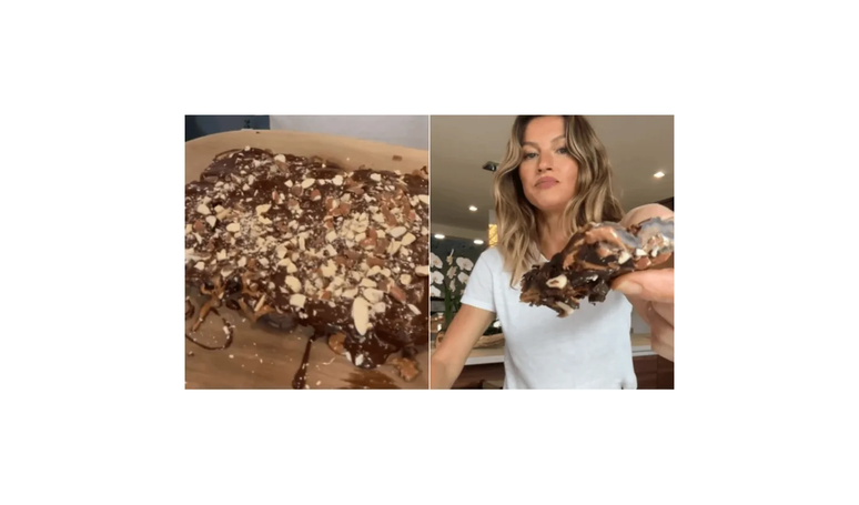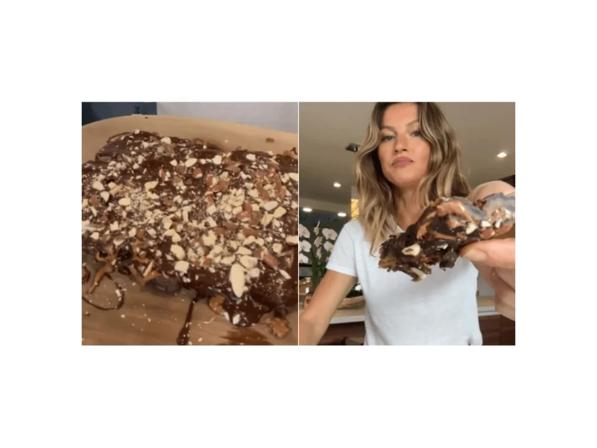 A combinação leva chocolate amargo, tâmaras, pasta de amêndoas e amêndoas picadas, resultando em um doce prático e cheio de energia. A preparação é rápida, e o passo mais trabalhoso é apenas derreter o chocolate em banho-maria. Na publicação em que mostrou o preparo, Gisele destacou sua aprovação: "Foi uma das receitas mais recomendadas, parecia super gostosa e fácil de fazer. Meu veredito: é deliciosa!".