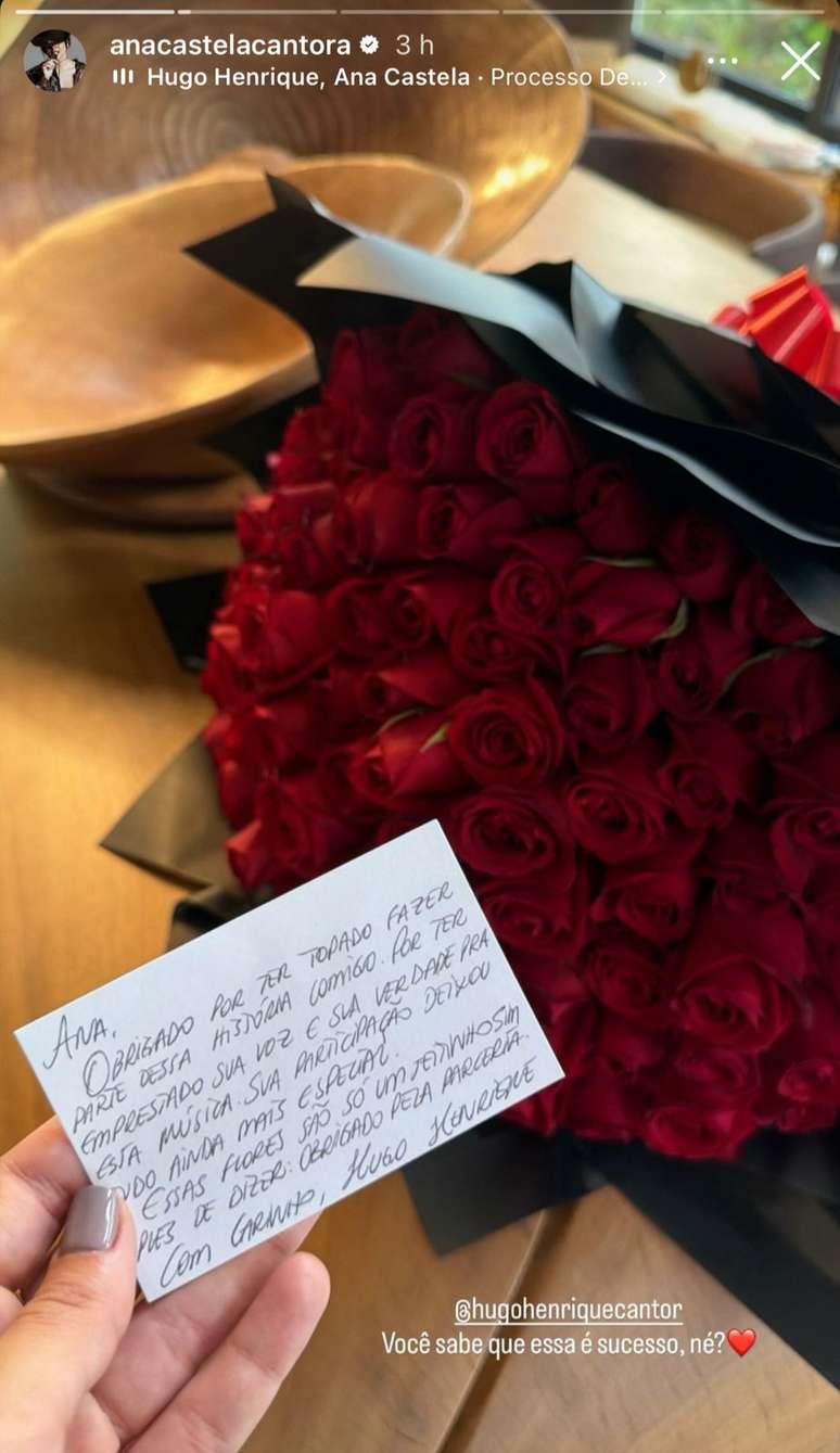 No bilhete, Hugo Henrique escreveu: "Ana, obrigado por ter topado fazer parte dessa história comigo. Por ter emprestado sua voz e sua verdade pra esta música. Sua participação deixou tudo ainda mais especial. Essas flores são só um jeitinho simples de dizer: obrigado pela parceria. Com carinho, Hugo Henrique". O gesto reforçou a sintonia artística entre os dois e celebrou o alcance da colaboração.