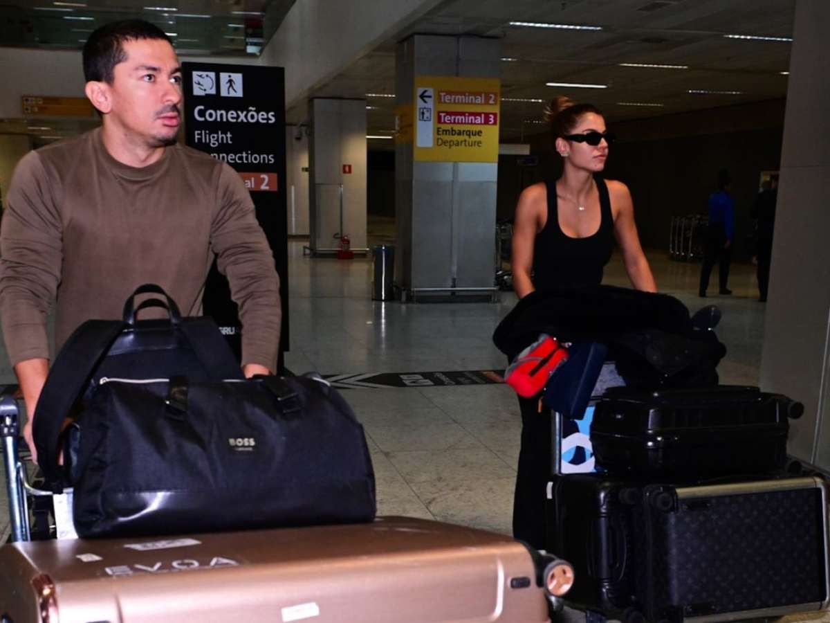 No desembarque, Renan empurrava um carrinho com quatro bagagens e a namorada, um segundo, com outras quatro. Hariany "quebrou" o aerolook all black com sapatos brancos, usou óculos escuros e prendeu os cabelos em formato de coque.