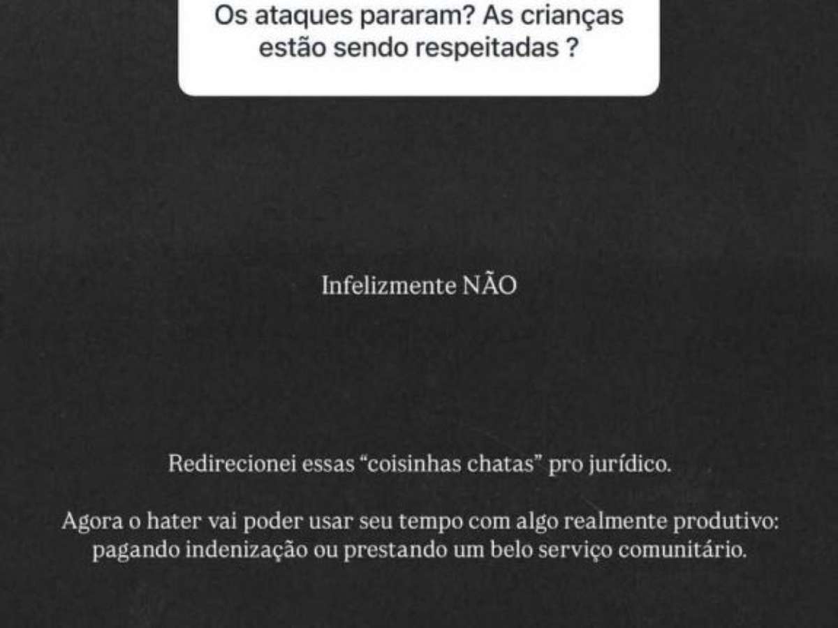 "Os ataques pararam? As crianças estão sendo respeitadas?", questionou uma internauta, referindo-se à Helena e os outros dois filhos de Neymar, Mavie e Davi Lucca. Porém, a famosa negou e avisou que decidiu acionar o jurídico.