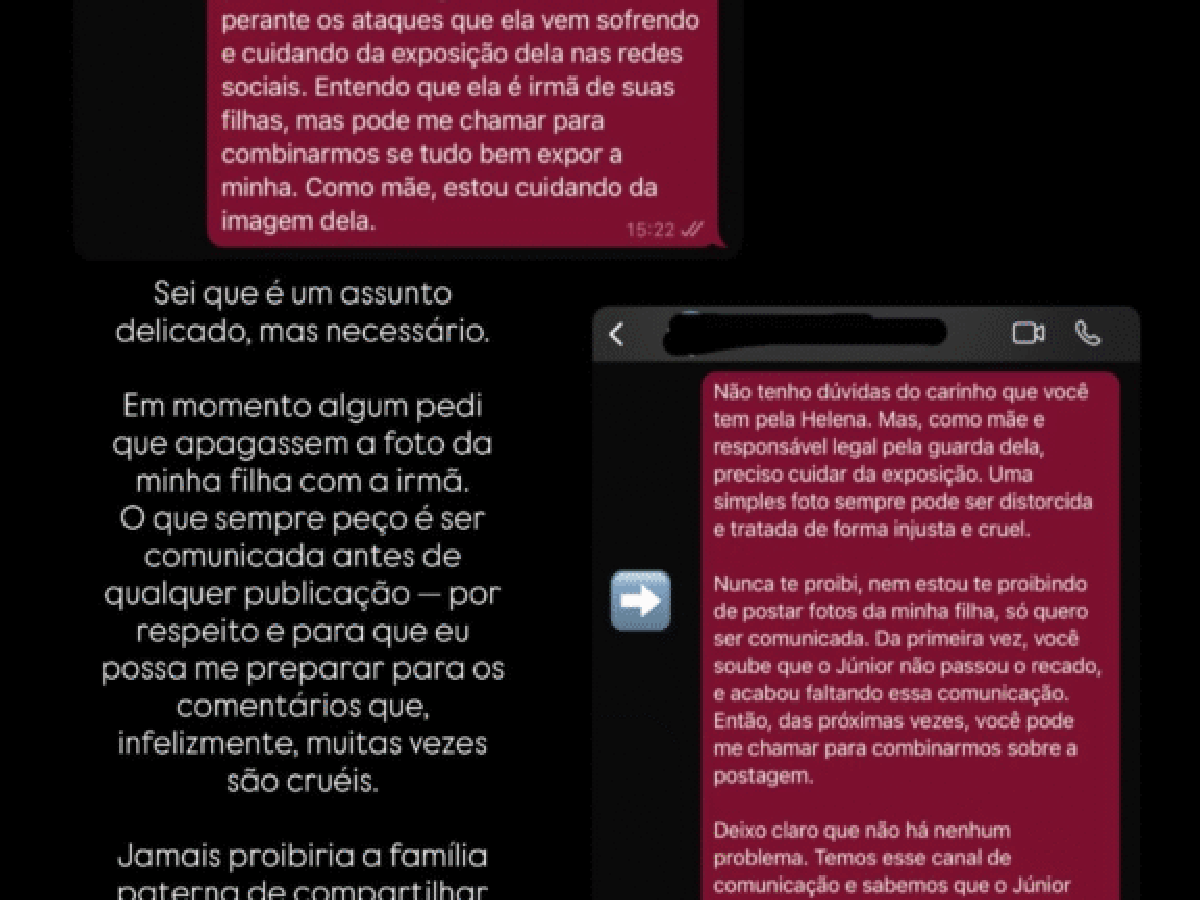 "Vi que, novamente, você postou a minha filha sem me perguntar. Quero que, da próxima vez, me comunique. Estou preservando a imagem da Helena perante os ataques que ela vem sofrendo e cuidando da exposição dela nas redes sociais. Entendo que ela é irmã de suas filhas, mas pode me chamar para combinarmos se tudo bem por ela e por mim. Como mãe, estou cuidando da imagem dela".