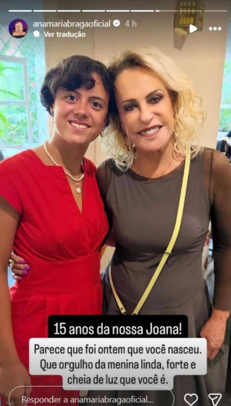 O motivo da homenagem foi o aniversário de 15 anos de Joana, sua neta mais velha, filha de Mariana Maffeis. Ao relembrar o nascimento da adolescente, Ana Maria destacou o quanto o tempo passou rápido e como acompanha de perto cada etapa do crescimento da jovem. Em sua mensagem, a comunicadora fez questão de ressaltar traços de personalidade e valores que, segundo ela, definem a neta. "15 anos da nossa Joana! Parece que foi ontem que você nasceu. Que orgulho da menina linda, forte e cheia de luz que você é", escreveu, emocionando seguidores.